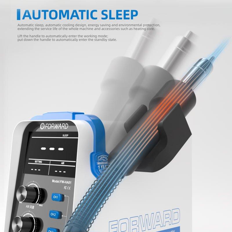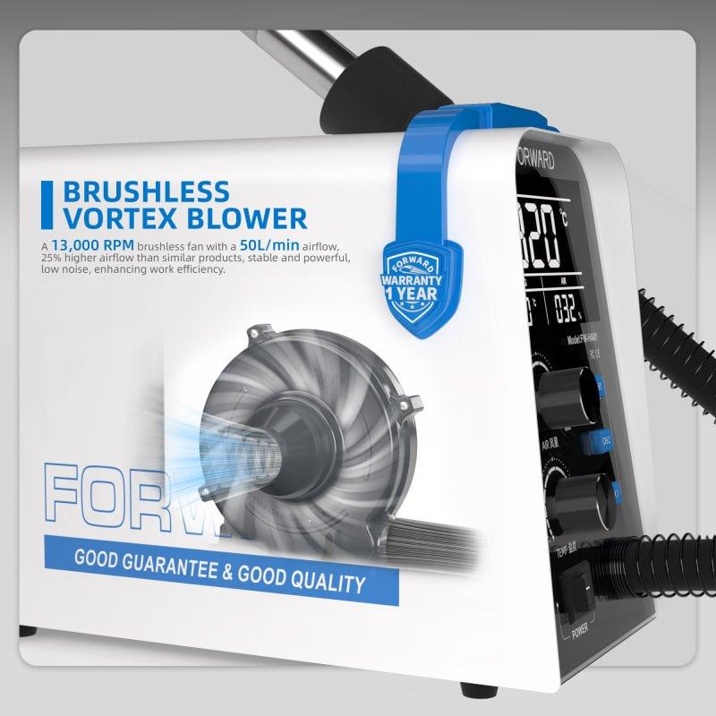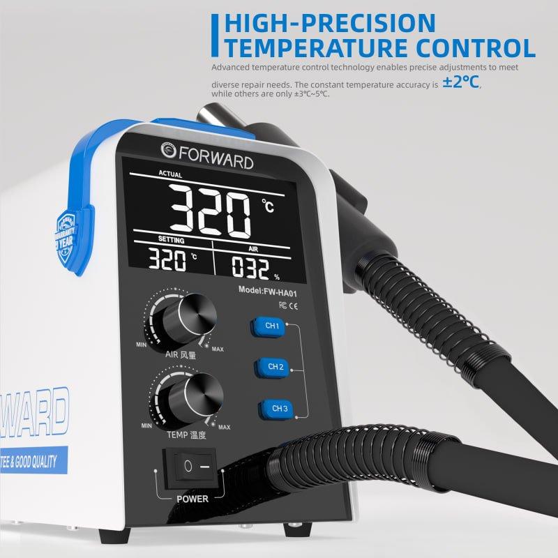 The Forward FW-HA01 is a professional 800W hot air rework station engineered for precision and speed. It features ultra-rapid 3-second heating, superior temperature accuracy of +/-2°C, and a powerful brushless vortex fan for efficient repairs.