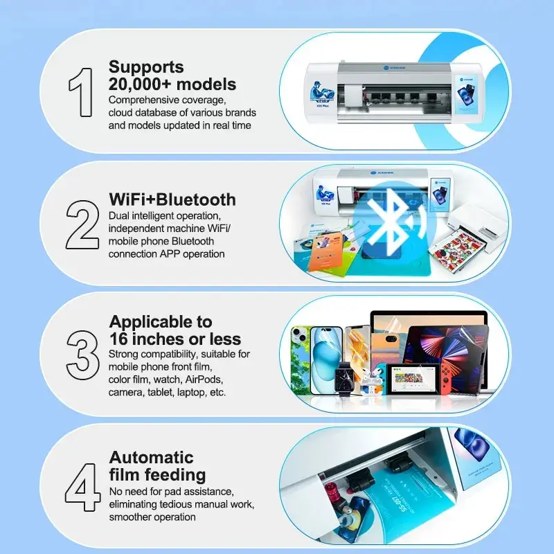 The SUNSHINE Y25 Plus Unlimited Times 16 Inches Smart Cloud Film Cutting Machine features dual intelligent operation, WiFi & Bluetooth APP control, automatic film feeding, and supports 16-inch or smaller devices, including mobile phones, watches, AirPods, tablets & laptops. Comes with 80+ languages and strong compatibility with SS-057, SS-075 & RELIFE series films.