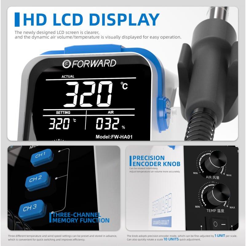 The Forward FW-HA01 is a professional 800W hot air rework station engineered for precision and speed. It features ultra-rapid 3-second heating, superior temperature accuracy of +/-2°C, and a powerful brushless vortex fan for efficient repairs.