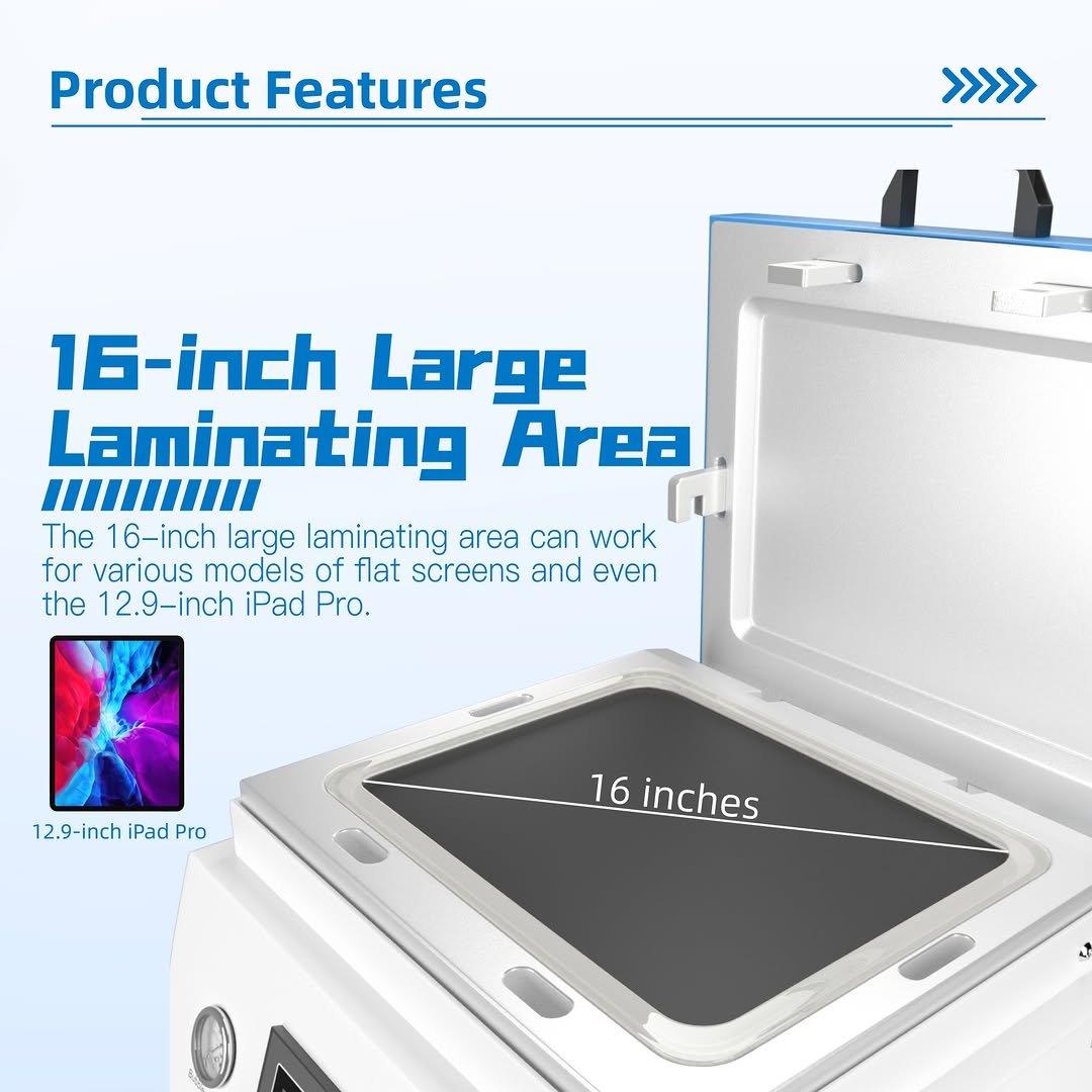 The Forward IOS is a professional 16-inch automatic OCA lamination machine designed for all flat screens, including iPad Pro. It features a large cylinder, patented safety airlock, and built-in air treatment for safe, reliable, and bubble-free lamination right out of the box.