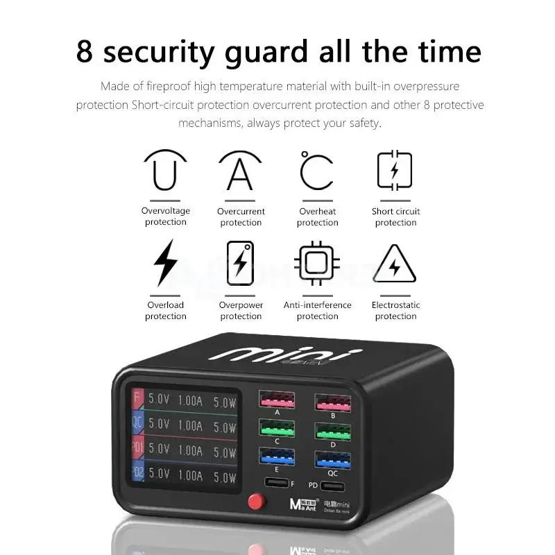 Safety is a critical factor in any repair environment. The MaAnt Dianba Mini 75W Multi-function 8-Port Support PD Fast Charging comes with 8 built-in protection mechanisms, including: