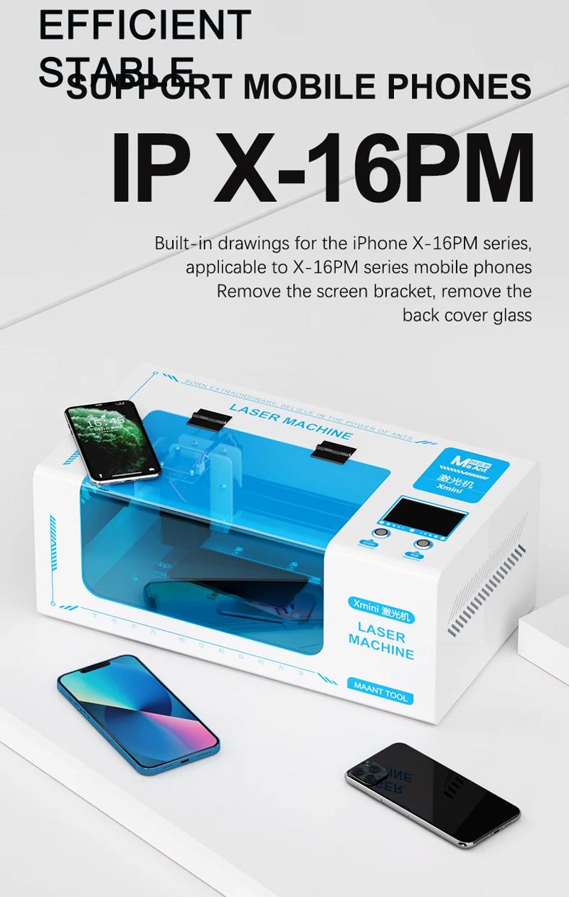 The MaAnt Xmini Laser Machine for iPhone Back Glass and Screen Bracket Removalis a compact, high-precision laser solution engineered for professional mobile repair technicians. Designed to handle modern iPhones from iPhone 8 to iPhone 16 Pro Max, this machine simplifies one of the most difficult repair tasks—back glass removal and screen bracket separation—while reducing damage risk and improving repair quality.