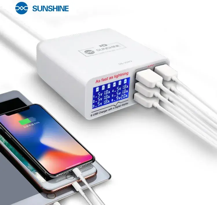 The Sunshine SS-304Q 6 Port Intelligent USB Fast Charger supports QC 3.0 fast charging and powers up to 6 devices simultaneously. With smart detection technology, it ensures safe, fast, and efficient charging for mobiles, tablets, and digital devices.